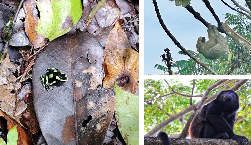 Poison dart frog, sloth, and howler monkey