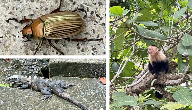 Gigantic beetle, iguana, and capuchin monkey