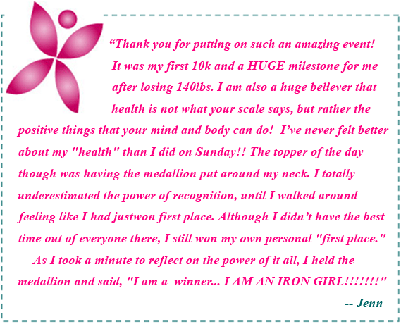 "I ran the Iron Girl 10k in Clearwater and enjoyed every minute of it. What a great way for women to come together and raise money for a good cause but also do something good for themselves." -- Marjorie Pulver
