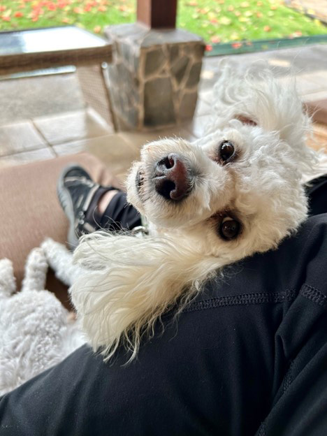 WOW: Oscar was a ray of sunshine each day! He was my constant companion on the patio, content to just stretch out on my legs and nap while I wrote, looking out at your majestic African tulip tree. Dog lovers, I think, will surely appreciate his company.